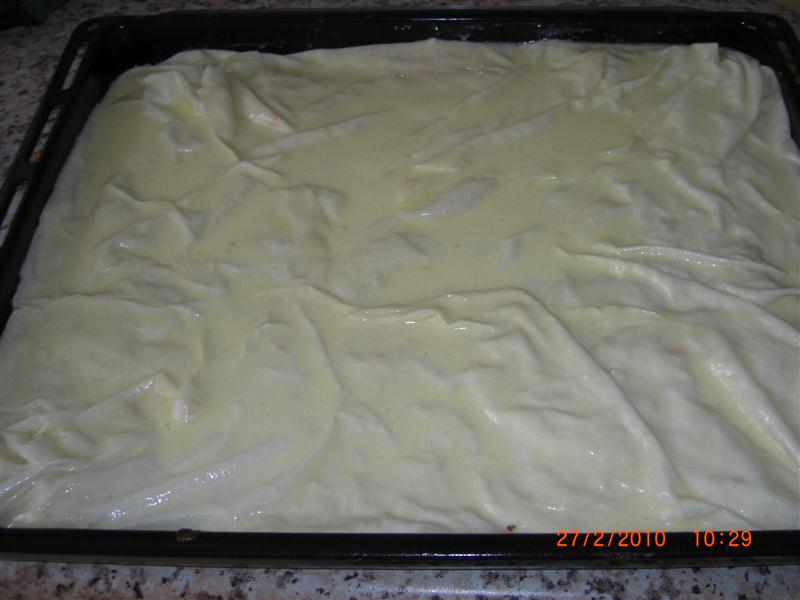 5. 2 adet yufkayı tek tek sıvı karışımın içinde ıslatın, ister parça parça, isterseniz bütün olarak yağladığınız ve tabanına yufka serdiğiniz tepsiye düzgünce yayın.